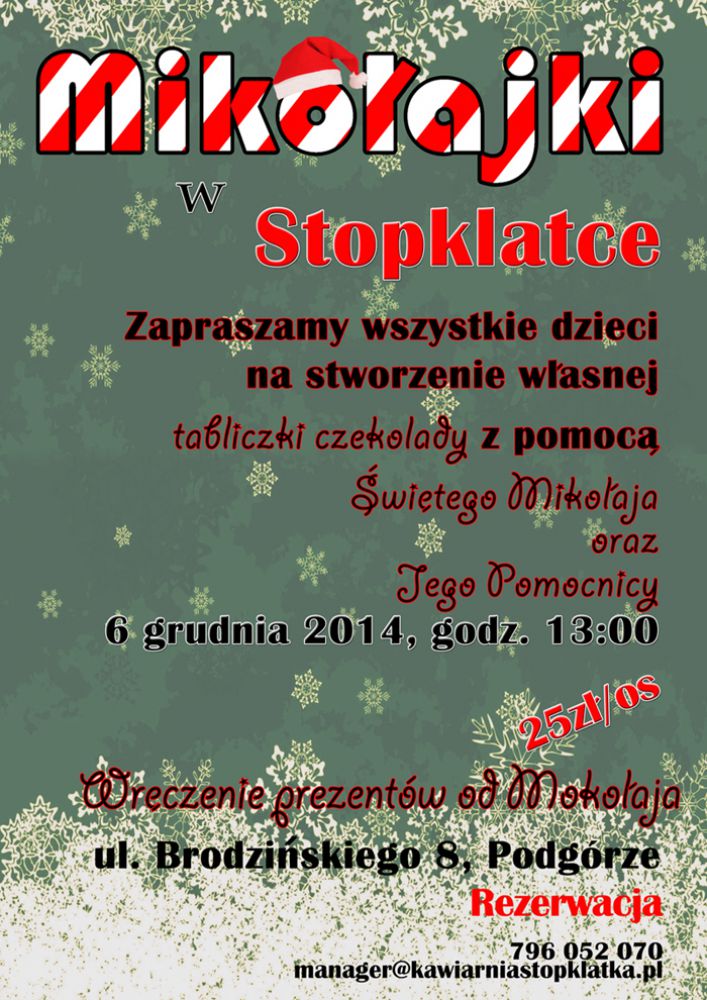 Drogie Dzieci! Kawiarnia Stopklatka zaprasza Was na niezwykłe warsztaty, na których pod czujnym okiem Œwiętego Mikołaja i jego pomocnicy przygotujecie niepowtarzalny upominek dla swoich bliskich (albo dla siebie)w postaci autorskiej czekolady!