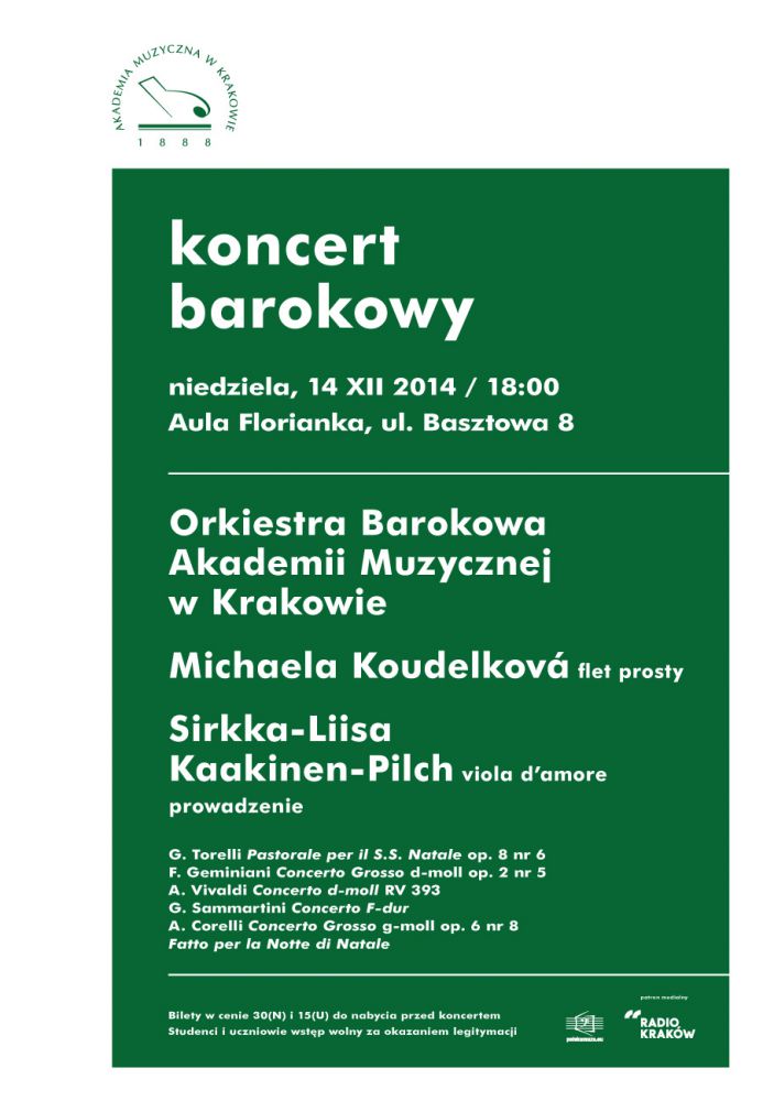 W niedziel 14 grudnia o godzinie 18:00 wntrze Auli Florianka (ul. Basztowa 8) wypeni muzyka mistrzw barokowych kompozycji, m.in. Arcangelo Corellego, Giuseppe Torellego i Antonio Vivaldiego. Orkiestr Barokow Akademii Muzycznej w Krakowie prowadzi znakomita skrzypaczka Sirka-Liisa Kaakinen-Pilch.