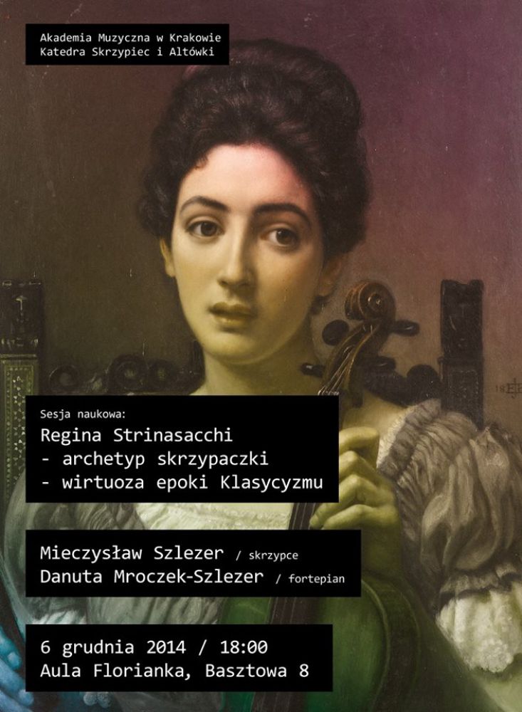 W sobotę 6 grudnia o godzinie 18:00 w Auli Florianka, podczas Sesji naukowej Regina Strinasacchi archetyp skrzypaczki wirtuoza epoki Klasycyzmu, zostanš zaprezentowane skrzypce dzieła syna Reginy Strinasacchi jednego z najlepszych lutników swojej epoki. Na prezentację zapraszajš: Mieczysław Szlezer (skrzypce) oraz towarzyszšca na fortepianie Danuta Mroczek-Szlezer. Wstęp wolny!
