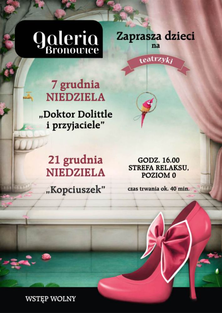 Spektakl Kopciuszek odbędzie się 21 grudnia o godz. 16.00 w Galerii Bronowice (parter). Czas trwania: ok. 40 min.