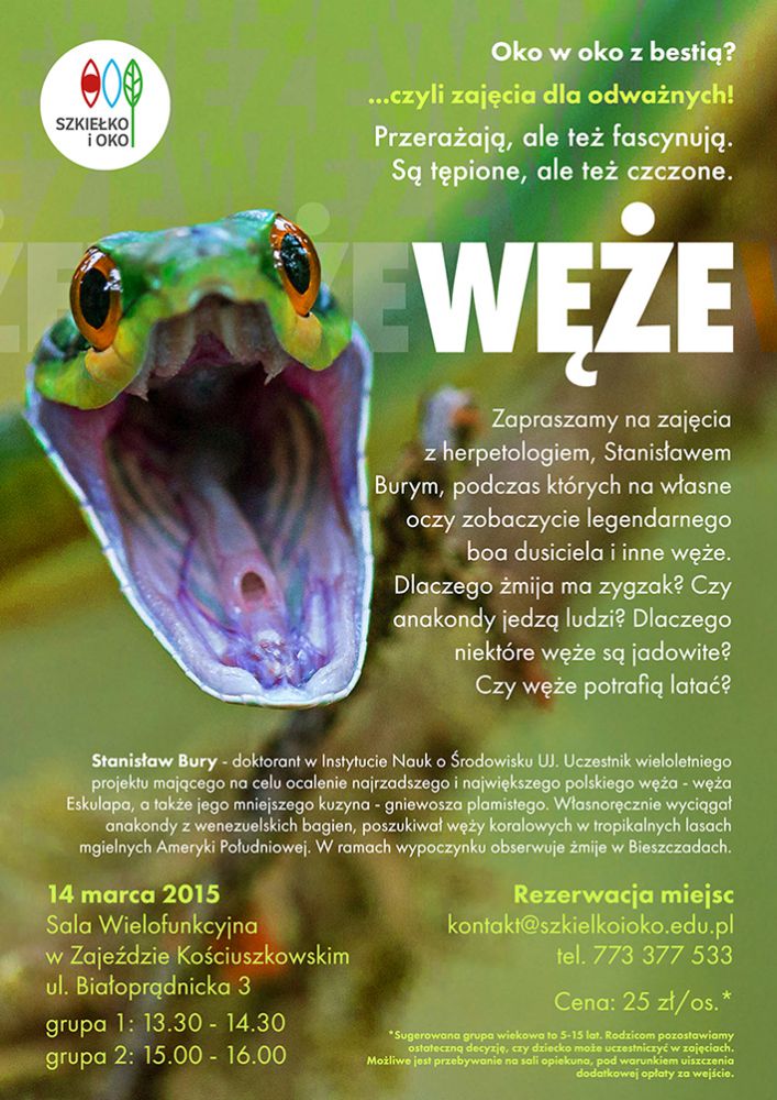 Zapraszamy na zajęcia z herpetologiem, podczas których na własne oczy zobaczycie legendarnego boa dusiciela i inne węże. Dlaczego żmija ma zygzak? Czy anakondy jedzš ludzi? Dlaczego niektóre węże sš jadowite? Czy węże potrafiš latać?