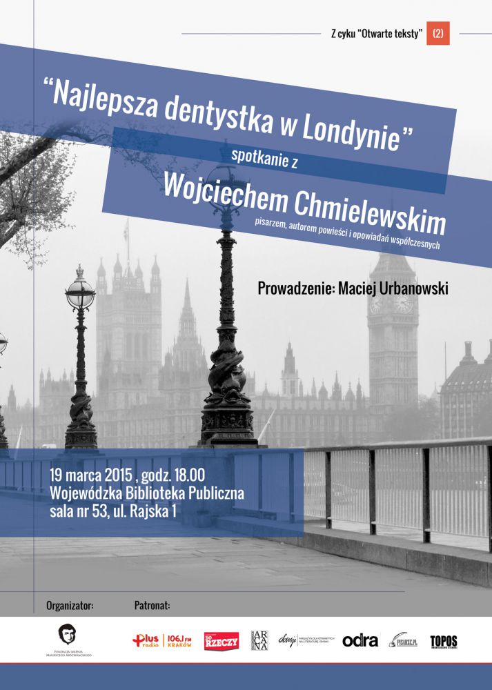 Fundacja im. M. Mochnackiego serdecznie zaprasza na kolejne spotkanie autorskie z cyklu "Otwarte teksty". Tym razem naszym gociem będzie autor opowiadań, esejów i recenzji - Wojciech Chmielewski. Spotkanie poprowadzi dr hab. Maciej Urbanowski - krytyk literacki, historyk literatury polskiej, kierownik Katedry Krytyki Współczesnej na Wydziale Polonistyki Uniwersytetu Jagiellońskiego.
