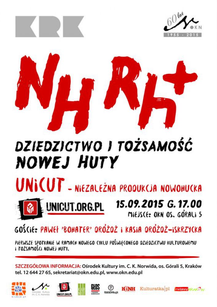 Pierwsze spotkanie w ramach nowego cyklu powięconego dziedzictwu kulturowemu i tożsamoci Nowej Huty. Goćmi będš Paweł Bohater Dróżdż i Kasia Dróżdż-Iskrzycka współzałożyciele UNICUT Niezależna Produkcja Nowohucka.