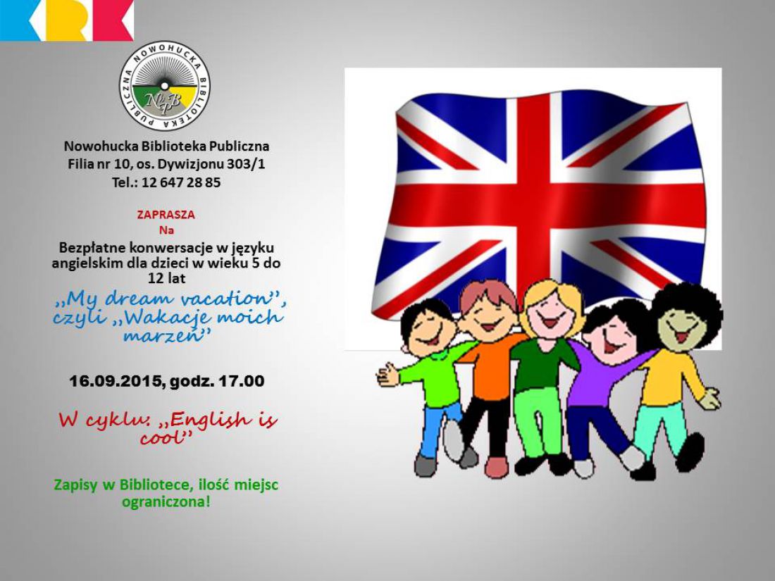 Biblioteka na zajcia konwersacyjne w jzyku angielskim dla dzieci w wieku od 5 12 lat. My dream vacation, czyli Wakacje moich marze. Spotkanie odbywa si w cyklu: English is cool. Na pierwszym spotkaniu dzieci przypomn sobie sownictwo zwizane z wakacjami poprzez wiczenia jzykowe i zabawy edukacyjne.