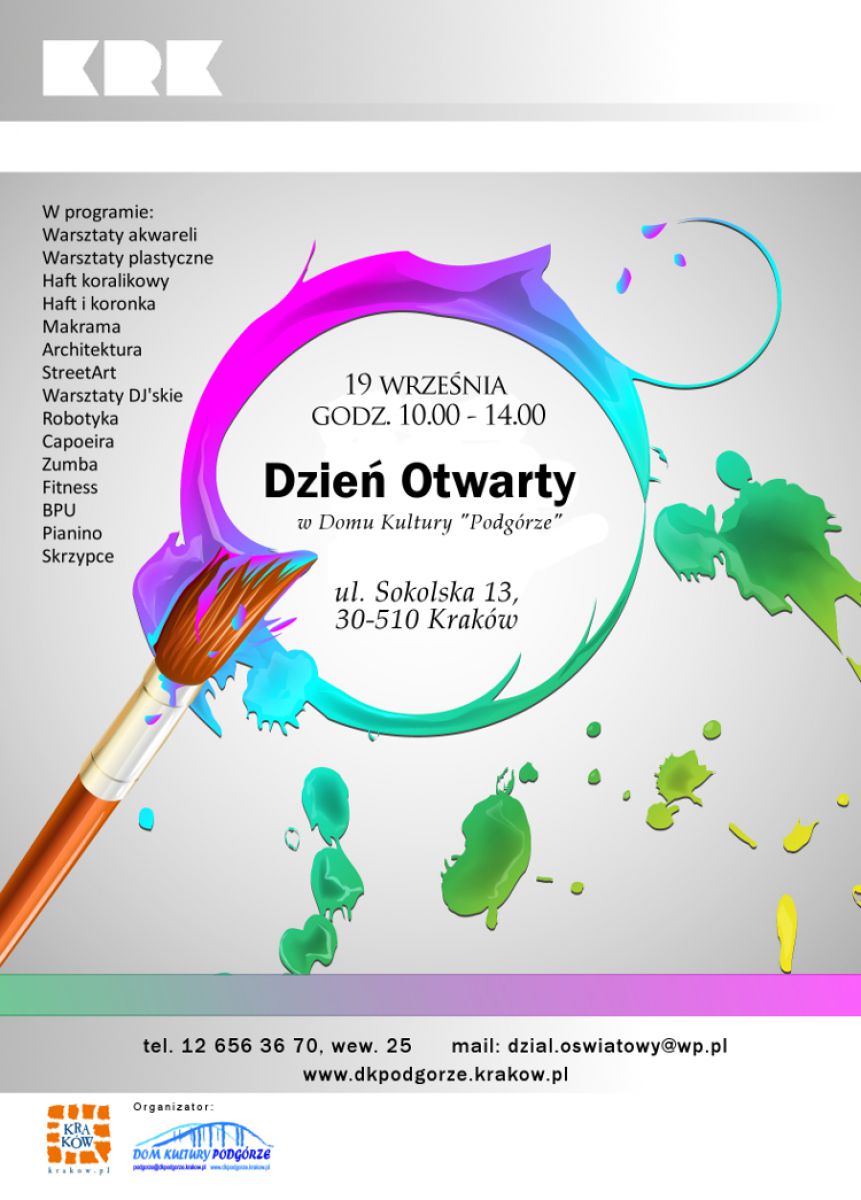 Zobacz, jak wyglšdajš zajęcia w naszym Domu Kultury! Podczas Dnia Otwartego bezpłatnie skorzystasz z dużej dawki ruchu: zumba, BPU, fitness, capoeira, sprawdzisz swoje zdolnoci plastyczne podczas wielu różnych zajęć rękodzielniczych, wemiesz udział w warsztach edukacyjnych m.in robotyki, DJskich i Street Artu oraz wielu innych oferowanych w nowym roku kulturalno - owiatowym. Zapraszamy w sobotę 19 wrzenia w godzinach 10.00 - 14.00. Bezpłatny udział w zajęciach, rozmowy z instruktorami oraz zapisy!