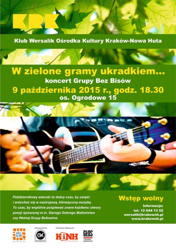 Wszystkich wielbicieli Krainy Łagodnoci Klub Wersalik Orodka Kultury Kraków-Nowa Huta (os. Ogrodowe 15) zaprasza na występ Grupy Bez Bisów. Padziernikowy wieczór to dobry czas, by usišć i wsłuchać się w nastrojowš, klimatycznš muzykę. To czas, by wspólnie popiewać znane każdemu utwory poezji piewanej m.in. Starego Dobrego Małżeństwa czy Wolnej Grupy Bukowina. To również dobra okazja, by wyjć z domu i spotkać się z osobami, którym bliskie sš te klimaty muzyczne. Zapraszamy 9 padziernika o godz. 18.30.