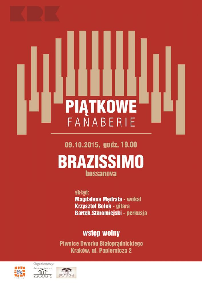 Brazissimo to zespół wykonujšcy muzykę z pogranicza fusion-brazil czyli opartš na rytmice samby, bossanovy, partido-alto i baiao. Na jego koncert zapraszamy w piatkowy wieczór do Dworku Białopršdnickiego. Odbędzie się w piwnicach o godz. 19.00. Wstęp wolny.
