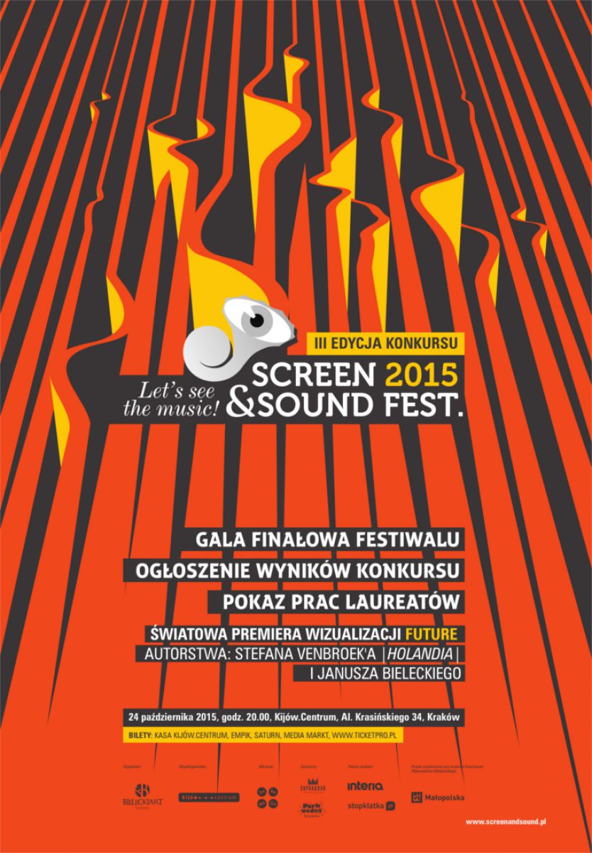Już 24 paŸdziernika o godz. 20:00 w Kijów. Centrum w Krakowie odbędzie się Gala Finalistów Screen & Sound Fest. 2015. Podczas wydarzenia nastšpi ogłoszenie wyników konkursu oraz pokaz prac laureatów! W programie także œwiatowa premiera wizualizacji Future autorstwa: Stefana Venbroek'a i Janusza Bieleckiego.
