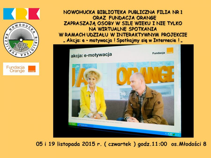 Filia nr 1 Nowohuckiej Biblioteki Publicznej w Krakowie i Fundacja Orange zapraszaj seniorw na innowacyjne zajcia. Spotkania odbywaj si ramach projektu Akcja: e-motywacja! Spotkajmy si w Internecie!. Uczestnicy spotkania, przy pomocy nowoczesnych technologii, pocz si ze studiem w Warszawie i wezm udzia w wirtualnym spotkaniu z aktork Helen Norowicz, ktra w wieku 80 lat zostaa modelk. Uczestnicy bd mogli zadawa pytania na specjalnie w tym celu przygotowanym czacie.