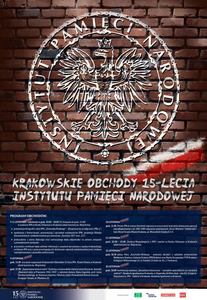 Oddział Instytutu Pamięci Narodowej w Krakowie zaprasza na „Krakowskie Obchody 15-lecia Instytutu Pamięci Narodowej”, które odbędš się w dniach 9-20 listopada 2015 r. Z tej okazji przygotowano dla Krakowian ciekawe i zróżnicowane propozycje wspólnego œwiętowania jubileuszu Instytutu.