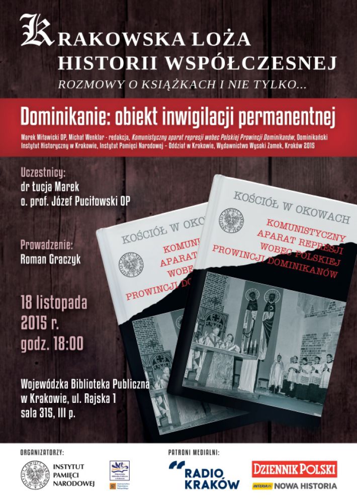 Instytut Pamięci Narodowej oraz Wojewódzka Biblioteka Publiczna w Krakowie zapraszajš na spotkanie w Krakowskiej Loży Historii Współczesnej: „Dominikanie: obiekt inwigilacji permanentnej”. W dyskusji wezmš dr Łucja Marek oraz o. prof. Józef Puciłowski (OP),