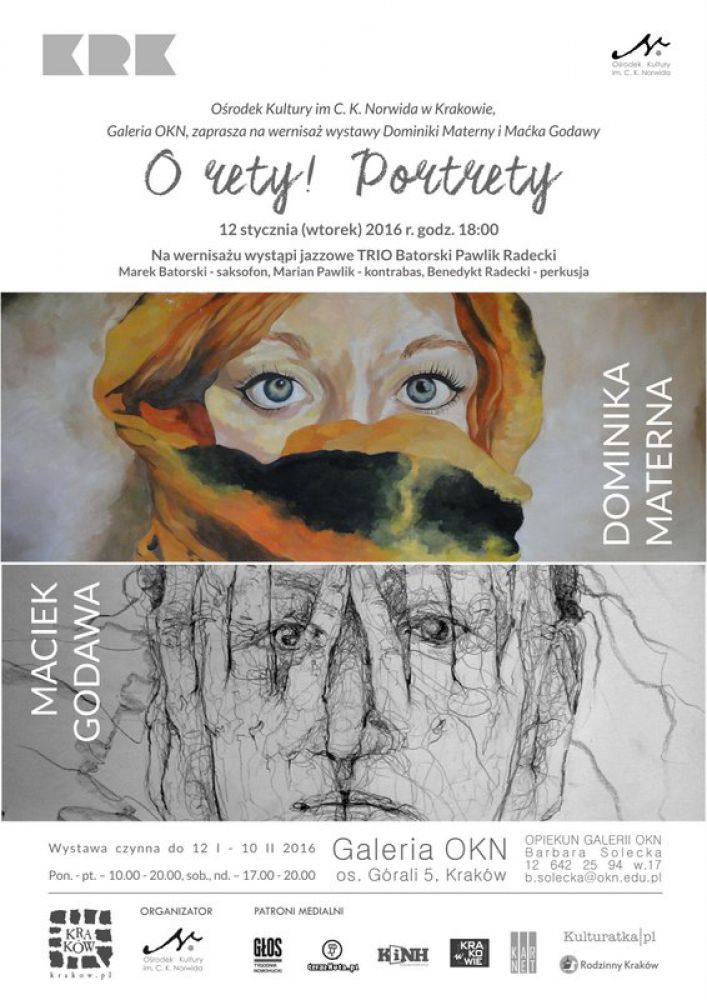 Oœrodek Kultury im. C. K. Norwida zaprasza na wernisaż wystawy „ O rety! Portrety ” Dominiki Materny i Macieja Godawy 12 stycznia 2016 r. o godzinie 18.00 do Galerii OKN na os. Górali 5 w Krakowie.