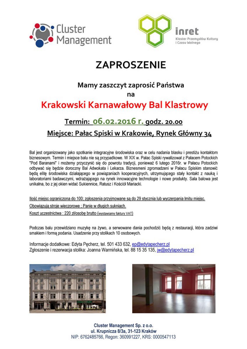Bal jest organizowany jako spotkanie integracyjne œrodowiska oraz w celu nadania blasku i prestiżu kontaktom biznesowym. Termin i miejsce balu nie sš przypadkowe. W XIX w. Pałac Spiski rywalizował z Pałacem Potockich "Pod Baranami" i możemy przyczynić się do powrotu tradycji, ponieważ 6 lutego 2016r. w Pałacu Potockich odbywać się będzie doroczny Bal Adwokata i Lekarza. Biznesmeni zgromadzeni w Pałacu Spiskim stanowić będš elitę œrodowiska działajšcego w powišzaniach kooperacyjnych, utrzymujšcego stały kontakt z naukš i laboratoriami badawczymi, wdrażajšcego na rynek innowacyjne technologie i nowe produkty. Sala balowa jest unikalna, bo z jej okien widać Sukiennice, Ratusz i Koœciół Mariacki.