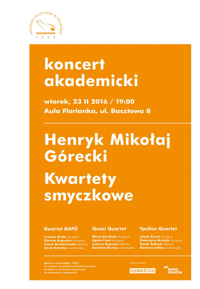 Twórczoć Henryka Mikołaja Góreckiego kojarzy się nam przede wszystkim z muzykš chóralnš. Wystarczy przywołać choćby fenomen jego III Symfonii, dzięki której nazwisko kompozytora stało się rozpoznawalne w całym wiecie, nie tylko muzycznym. Okazuje się jednak, iż Henryk Mikołaj Górecki jest również autorem kwartetów instrumentalnych, które choć mniej znane niż jego dzieła wokalne, frapujš nowatorstwem języka muzycznego, mistrzostwem formy i twórczš inwencjš. Choć niektóre podtytuły kwartetów wskazujš na ich wokalne inspiracje i konotacje. Wykonawcami tego koncertu, na którego program złożš się trzy kwartety Henryka Mikołaja Góreckiego, będš pedagodzy i studenci Akademii Muzycznej w Krakowie. Zapraszamy do Auli Florianka we wtorek 23 lutego na godzinę 19.00. Warto posłuchać Góreckiego w interpretacji pełnej młodzieńczej wieżoci z twórczego zapału. Bilety w cenie 30(N) i 15(U) do nabycia przed koncertem. Studenci i uczniowie wstęp wolny za okazaniem legitymacji.