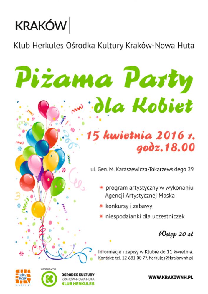Klub Herkules Oœrodka Kultury Kraków-Nowa Huta (ul. Gen. M. Karaszewicza-Tokarzewskiego 29) zaprasza 15 kwietnia na godz. 18.00 na Piżama Party! Impreza tematyczna jest ciekawš odskoczniš od nudnych i powszechnie organizowanych tzw. domówek. Tym razem będziemy bawić się w piżamkach, nocnych koszulkach lub dwuczęœciowych flanelkach, szlafmycach z jaœkami, miœkami i w kapciach. Mimo tego, z całš pewnoœciš nie będzie to senna impreza. Najlepsze piżamki oczywiœcie nagrodzimy!