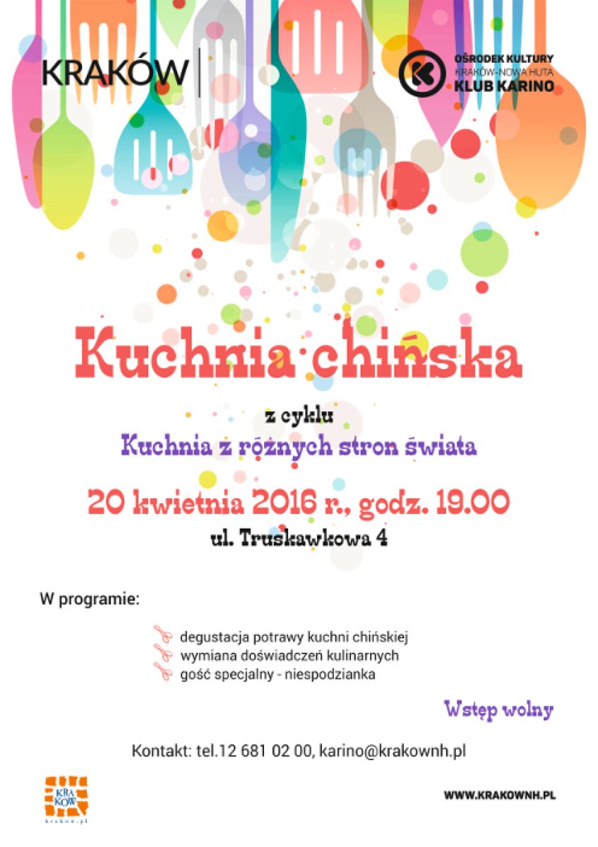 Klub Karino Orodka Kultury Kraków-Nowa Huta (ul. Truskawkowa 4) serdecznie zaprasza na kolejne kulinarne spotkanie, które odbędzie się 20 kwietnia o godz. 19:00.