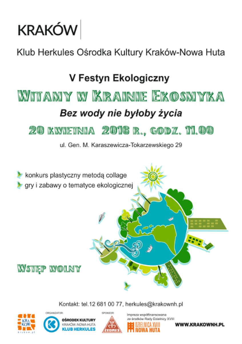 Klub Herkules Orodka Kultury Kraków-Nowa Huta (ul. Gen. M. Karaszewicza-Tokarzewskiego 29) serdecznie zaprasza na V edycję Festynu Ekologicznego Witamy w Krainie Ekosmyka - pod tytułem Bez wody nie byłoby życia. Impreza odbędzie się 20 kwietnia o godz. 11:00 i adresowana jest do dzieci, a jej celem jest zwrócenie uwagi społecznoci lokalnej na problemy rodowiska. Budzenie wiadomoci i wrażliwoci ekologicznej. W programie: konkurs plastyczny metodš collage, komponowanie prac według własnego pomysłu. Wystawa prac, zabawy i konkursy o tematyce ekologicznej.