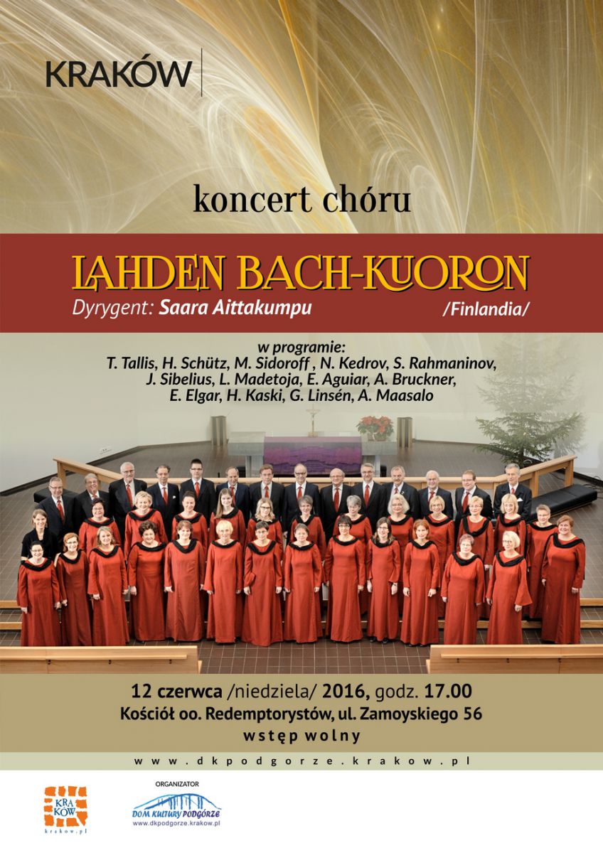 Fiński chór mieszany, imienia ,,Bacha z miasta Lahti w Finlandii, składajšcy się z 50 osób. Został założony w 1982 roku, od tego czasu z powodzeniem koncertuje po całej Finlandii jak i Europie.Dyrygentkš chóru jest Saara Aittakumpu, która ukończyła w 2007 r. z wyróżnieniem Akademię Muzycznš im. Sibeliusa w Helsinkach. Oprócz chóru z Lahti jest również dyrygentkš jak i artystycznym dyrektorem męskiego chóru The Polytech Choir. W swojej karierze artystycznej przygotowywała chóry do dużych projektów operowych i oratoryjnych. Na swoim koncie ma liczne nagrody między innymi w 2015 roku w ramach 5-go Międzynarodowego Konkursu dla dyrygentów im. Antona Brucknera w Austrii otrzymała specjalnš nagrodę Conductor Prize . Program koncertu:Thomas Tallis: If ye love me, Heinrich Schütz Aller Augen warten auf dich Herre, Kaikki katsovat sinua, Herra, Mikko Sidoroff Panihidan troparit, Kanonin kolmas veisu Kanonin kuudes veisu, Panihidan kontakki, Nikolai N. Kedrov Katso, kiittäkää Herraa, Sergei Rahmaninov Bogoroditse Devo, Jean Sibelius Soi kiitokseksi Luojan, Leevi Madetoja Ei mitään multa puutu, Ernani Aguiar Salmo 150, Anton Bruckner Locus iste, Edward Elgar As Torrents in Summer, Heino Kaski Kesäyö, Gabriel Linsén Kesäpäivä Kangasalla, Armas Maasalo Tuhansin kielin