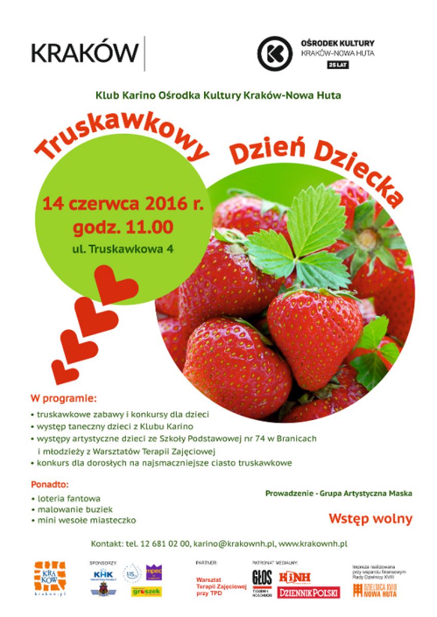 Klub Karino Oœrodka Kultury Kraków-Nowa Huta (ul. Truskawkowa 4) serdecznie zaprasza dzieci w wieku od 4 do 13 lat, młodzież z Warsztatów Terapii Zajęciowej oraz dorosłych na truskawkowe œwięto z okazji Dnia Dziecka, które odbędzie się 14 czerwca o godz. 11:00. W tym roku podczas truskawkowego festynu œwiętować będziemy jubileusz 25-lecia Oœrodka Kultury Kraków-Nowa Huta. Z tej okazji przewidziano wiele niespodzianek dla uczestników. Odbędš się truskawkowe konkursy i zabawy, które poprowadzi Grupa Estradowa Maska. Maluszków zapraszamy do udziału w konkursie plastycznym Truskawkowy Œwiat. Każde chętne dziecko będzie mogło mieć namalowanš truskawkę na buzi specjalnymi farbami ekologicznymi do twarzy. Dorosłym proponujemy próbę kulinarnych zdolnoœci w konkursie na Najsmaczniejsze ciasto truskawkowe. W trakcie imprezy dzieci będš mogły bezpłatnie korzystać z dmuchanego mini-wesołego miasteczka. Dla wszystkich uczestników imprezy przewidziano słodycze oraz œwieże truskawki.