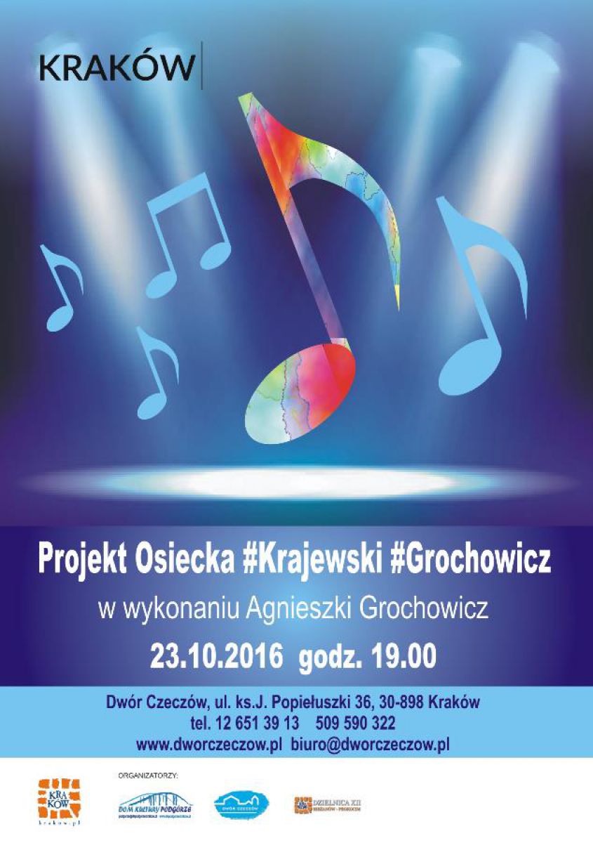 Projekt Osiecka #Krajewski #Grochowicz to utwory niezapomnianego tandemu Osiecka/Krajewski w nowych autorskich aranacjach z pogranicza jazzu i muzyki rozrywkowej w wykonaniu Agnieszki Grochowicz oraz wielokrotnie nagradzanych znakomitych jazzowych krakowskich muzykw m.in znanego basisty Antoniego Dbskiego. W programie synne utwory takie jak Ludzkie Gadanie, Uciekaj moje serce, Halo Szpicbrdka, ale i mniej znane stanowice mi niespodziank dla publicznoci. Program zrnicowany, od liryki do mocnego uderzenia. Znakomicie nadaje si zarwno do wykonania w przestrzeni zamknitej jak i w plenerze.
