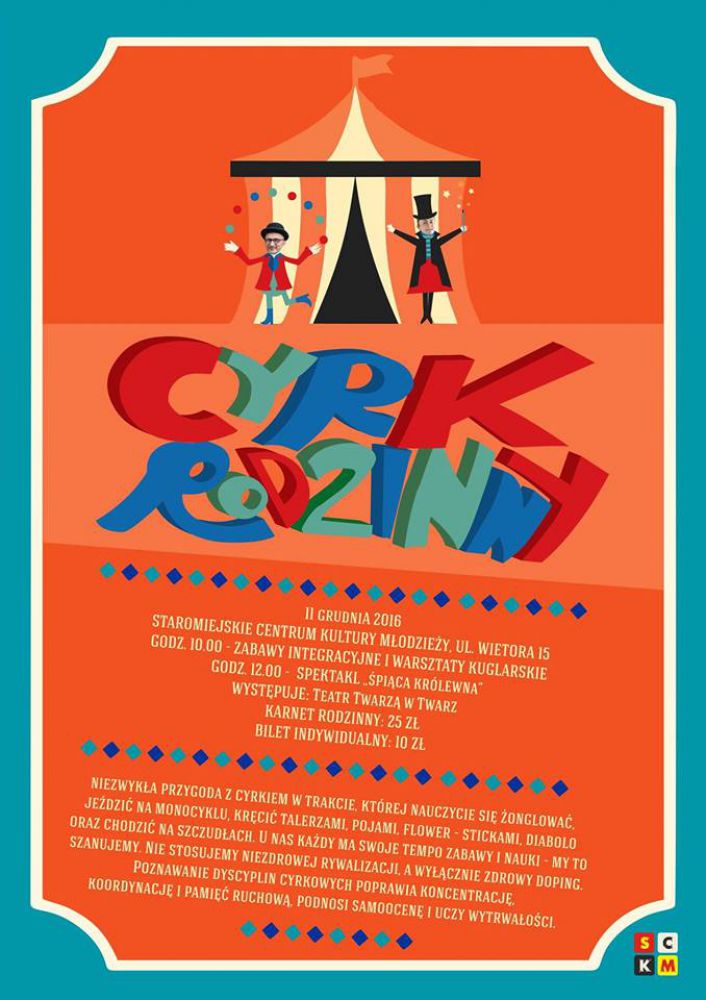 11 grudnia 2016 zapraszamy do Staromiejskiego Centrum Kultury Młodzieży, ul. Wietora 15 na Cyrk Rodzinny
