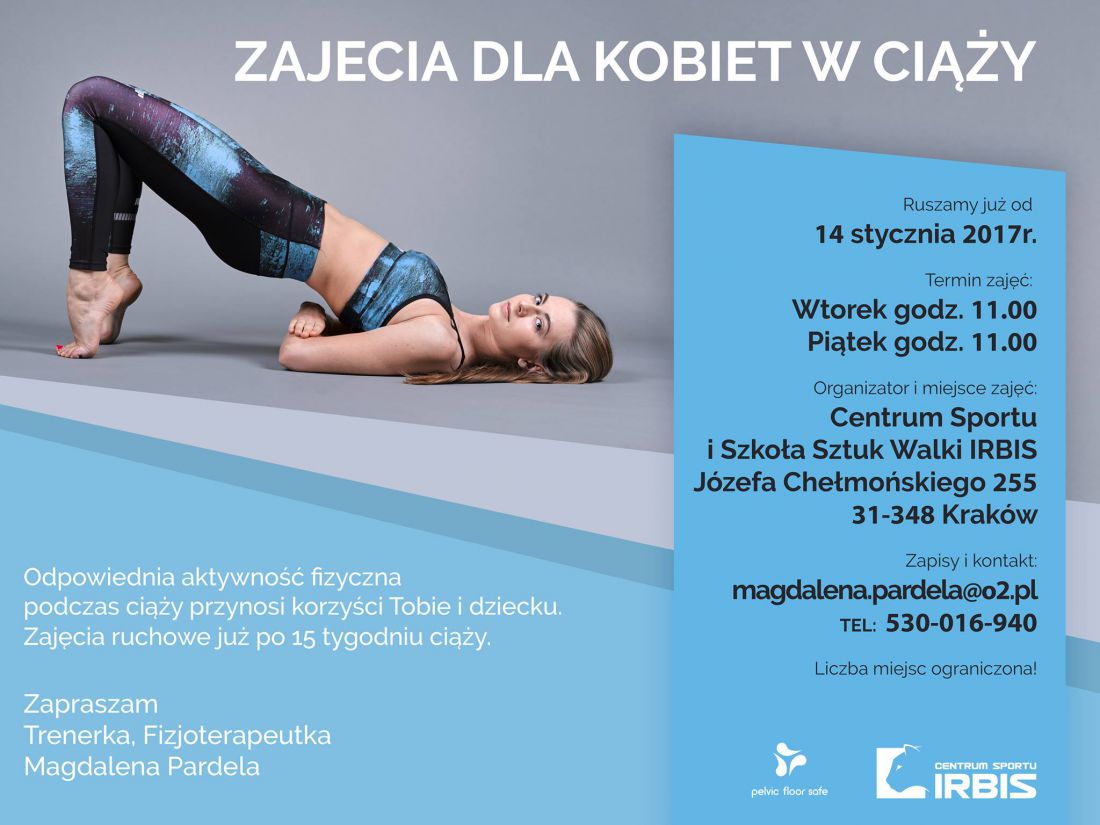 Zapraszam na pierwsze zajęcia poranne w Centrum Sportu IRBIS skierowane do kobiet w cišży 14 lutego 2017. Treningi prowadzi Magdalena Pardela, fizjoterapeutka oraz certyfikowana trenerka Pelvic Floor Safe PFSŽ trening bezpieczny dla kobiet z włšczeniem do zajęć ćwiczeń dna miednicy . Zajęcia dla kobiet już po 15 tygodniu cišży.