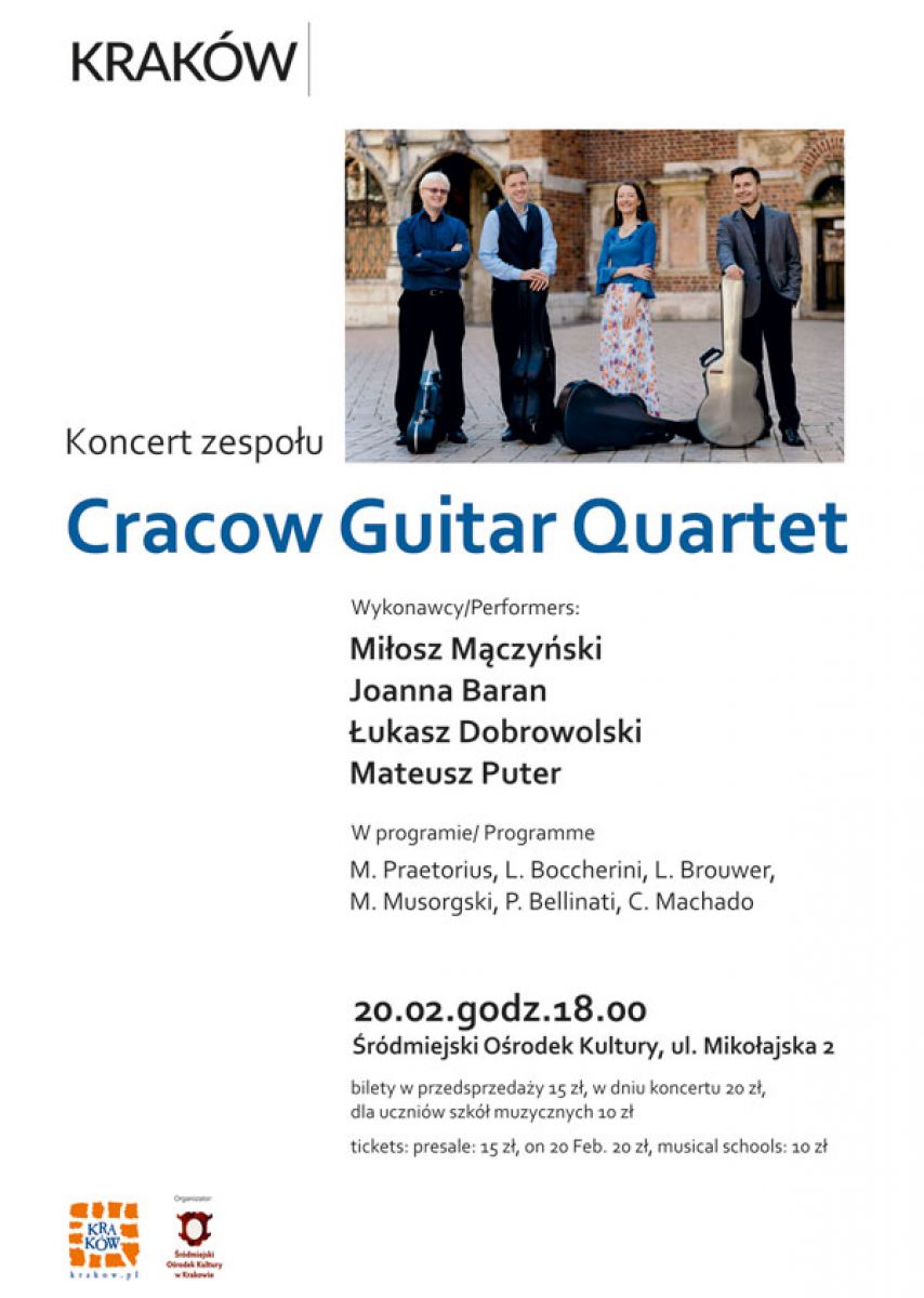 Zespół Cracow Guitar Quartet powstał w 2006 roku i współtworzš go artyci zwišzani z Krakowem: Miłosz Mšczyński, Joanna Baran, Łukasz Dobrowolski oraz Mateusz Puter. Zespół bierze udział w wielu projektach muzycznych w Polsce i za granicš, występuje na najbardziej prestiżowych festiwalach muzyki gitarowej, prowadzi lekcje mistrzowskie dla młodych wirtuozów tego instrumentu, ma na swoim koncie nagrania dla Polskiego Radia i Telewizji (w tym rejestrowany koncert w studiu Polskiego Radia). W 2009 roku otrzymał I nagrodę na XII Międzynarodowym Konkursie Gitarowym w Ile De Ré we Francji. W 2010 roku nakładem CM Records ukazała się płyta zespołu From Ballet to Tango, ukazujšcš piękno i bogactwo muzyki tanecznej od Renesansu do współczesnoci, od Europy po Amerykę Południowš, od arcydzieł mistrzów po pełne uroku formy oparte na muzycznym folklorze, a wszystko to, w nowym intrygujšcym brzmieniu czterech gitar klasycznych. Płyta zyskała znakomite recenzje w polskiej i zagranicznej prasie muzycznej, a obecnie Cracow Guitar Quartet uważany jest za czołowy polski zespół muzyki gitarowej.