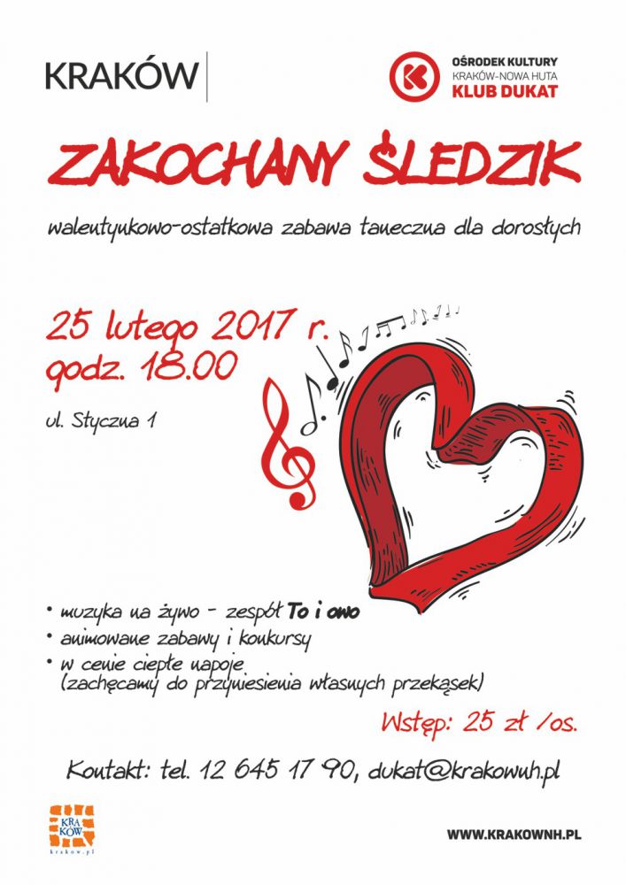 Klub Dukat Oœrodka Kultury Kraków-Nowa Huta (ul. Styczna 1) zaprasza w sobotę 25.02. o godz. 18.00 na walentynkowo-ostatkowš zabawę taneczna dla dorosłych. Do tańca zagra zespół To i owo. Podczas imprezy prowadzone będš animowane zabawy i konkursy, a dla uczestników - jak zawsze - przygotowane zostanš niespodzianki. Organizatorzy zapewniajš ciepłe napoje. Zachęcamy do przyniesienia własnych przekšsek.
