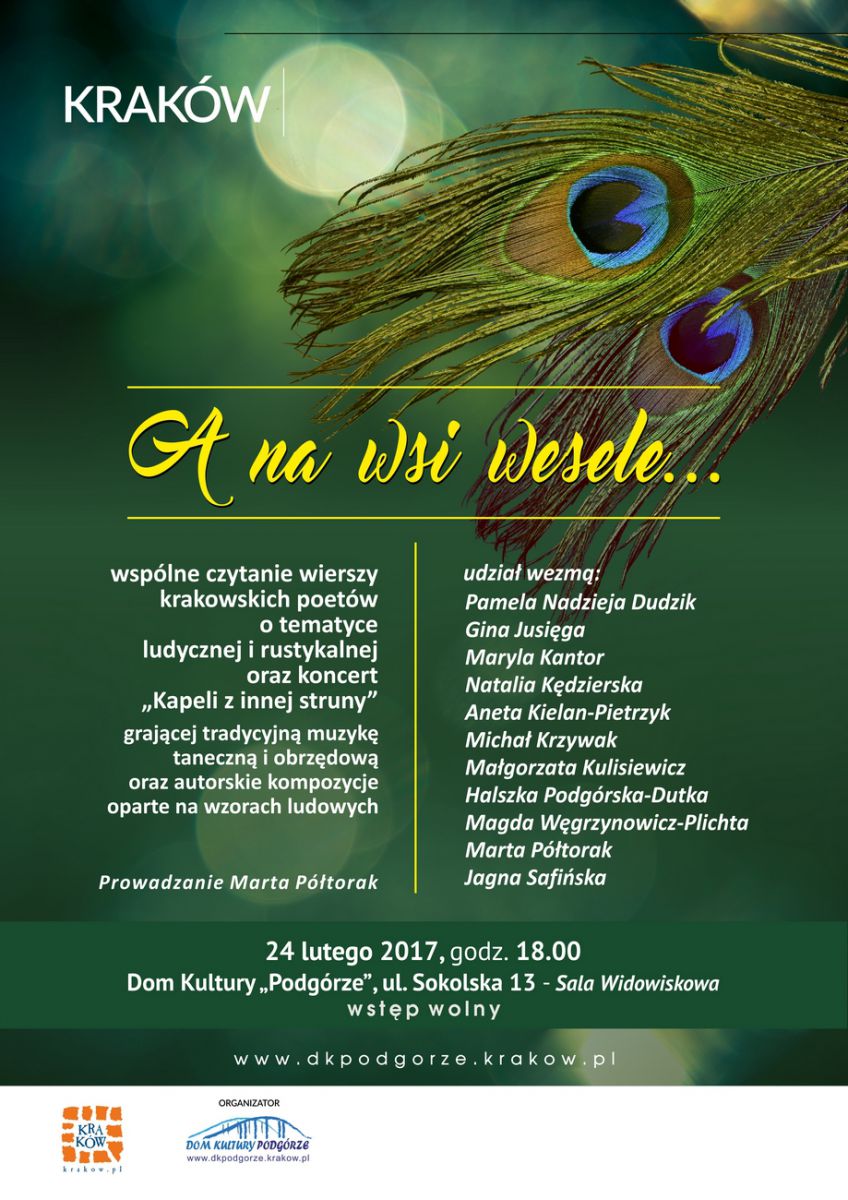" A na wsi wesele wsplne czytanie wierszy krakowskich poetw o tematyce ludycznej i rustykalnej oraz koncert Kapeli z innej struny grajcej tradycyjn polsk muzyk taneczn i obrzdow oraz autorskie kompozycje oparte na wzorach ludowych.