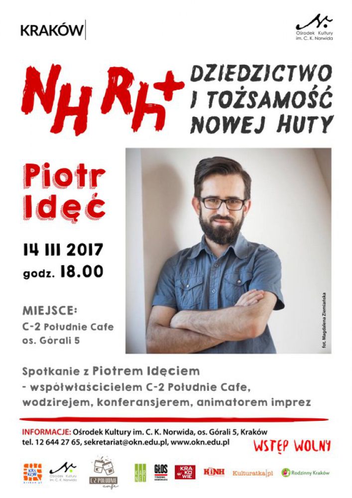 Spotkanie z Piotrem Idęciem - współwłacicielem C-2 Południe Cafe, wodzirejem, konferansjerem, animatorem imprez. Spotkanie w ramach cyklu NH Rh+ Dziedzictwo i tożsamoć Nowej Huty. Wstęp wolny.