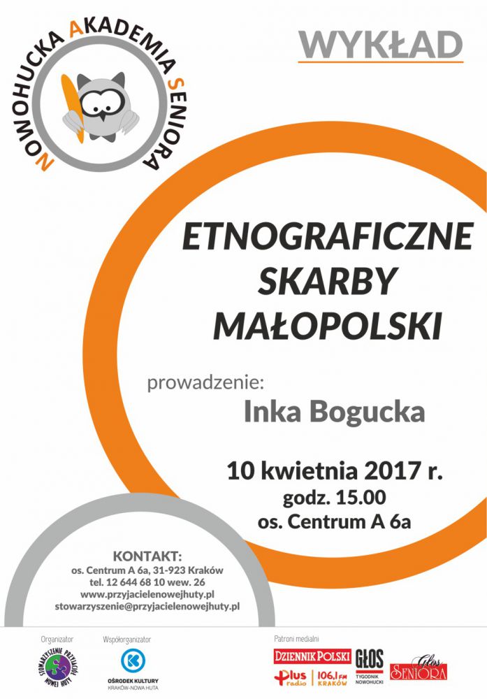 Nowohucka Akademia Seniora (os. Centrum A 6a) zaprasza 10 kwietnia o godz. 15.00 na wykład powięcony obrzędowoci grup etnicznych z terenu Małopolski, który wygłosi Inka Bogucka - Dziennikarka Telewizji Kraków i etnograf. Tereny Małopolski zamieszkuje wiele grup etnograficznych, które mimo ich odrębnoci kulturowych łšczy wiele. Do dzisiejszego dnia, obserwujemy wcišż żywš jeszcze obrzędowoć, między innymi tę, która wišże się z porami roku, zwłaszcza jego zimowego i letniego przesilenia. Zbliżajšce się więta Wielkiej Nocy sš doskonałym pretekstem do zaprezentowania ogromnego bogactwa rytualnych zachowań, do dzi towarzyszšcych czasowi wiosennego więtowania.