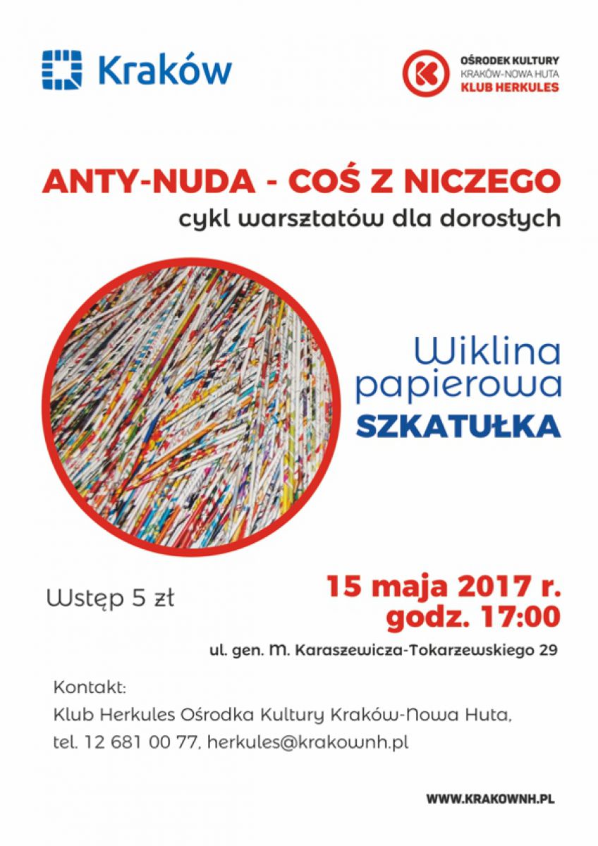 Klub Herkules Orodka Kultury Kraków-Nowa Huta (ul. Gen. M. Karaszewicza-Tokarzewskiego 29)zaprasza dorosłych na kolejne warsztaty z cyklu "Anty - nuda", które odbędš się 15.05. o godz. 17.00.
