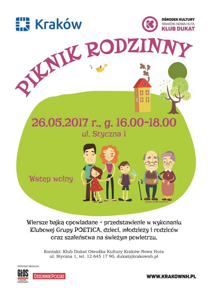 Klub Dukat Oœrodka Kultury Kraków-Nowa Huta (ul. Styczna 1) serdecznie zaprasza 26 maja w godz. 16.00-18.00 na Piknik rodzinny z okazji Dnia Rodziny. W programie znajdš się Wiersze bajkš opowiadane w wykonaniu Klubowej Grupy POETICA, dzieci, młodzieży i rodziców oraz szaleństwa na œwieżym powietrzu. Patronat medialny: Dziennik Polski, Głos. Tygodnik Nowohucki.