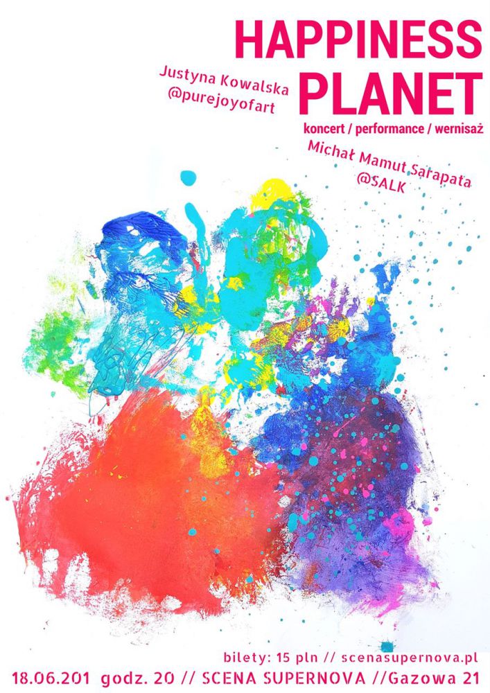 Koncerto/performance towarzyszyć będzie oficjalnemu malarskiemu coming-outowi reżyserki, czyli wernisażowi jej kolorowych obrazów abstrakcji, które podkręcajš pozytywne wibracje. Obrazy powstały podczas kosmicznej wyprawy artystki w poszukiwaniu Planety Szczęcie - https://www.facebook.com/events/1773543149631462/