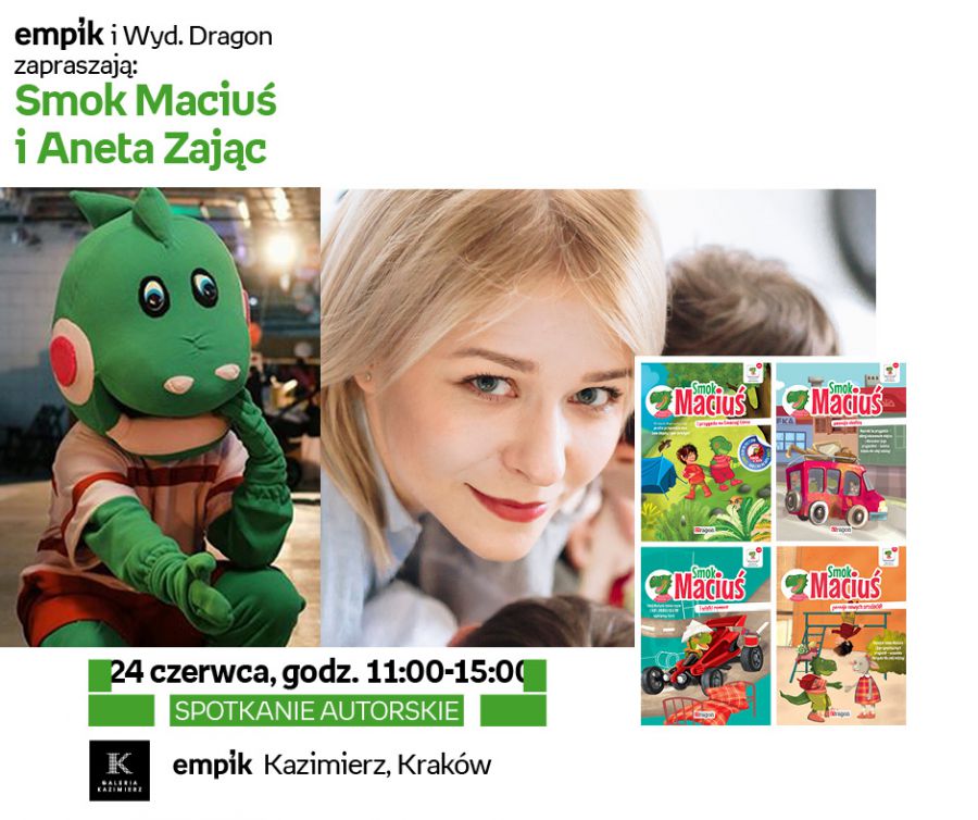 4 godziny wymienitej zabawy, 4 przeczytane przez Anetę Zajšc ksišżki o przygodach Smoka Maciusia, dużo przytulania, pištek, rozmów, zabawy oraz radoci. To wszystko czeka Cię 24 czerwca w salonie Empik Kazimierz w Krakowie.