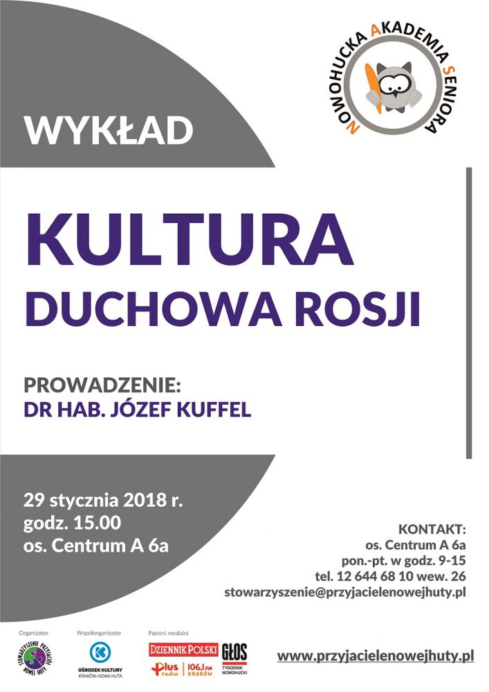 Nowohucka Akademia Seniora (os. Centrum A 6a) zaprasza na ostatni wykład w zimowym semestrze w poniedziałek 29 stycznia o godz. 15.00. Tematem wykładu będzie kultura duchowa Rosji. Goœć NAS - dr hab. Józef Kuffel, poruszy m.in. zagadnienia prawosławnej liturgiki i duchowoœci oraz prawosławnego kalendarza liturgiczny – cyklu œwišt stałych. Dr hab. Józef Kuffel jest adiunktem w Katedrze Œredniowiecznej i Nowożytnej Literatury Rosyjskiej Instytutu Filologii Wschodniosłowiańskiej Wydziału Filologicznego UJ. W swych badaniach naukowych oraz pracy dydaktycznej zajmuje się głównie cerkiewnosłowiańskš oraz rosyjskš literaturš religijnš, zasadniczy temat jego badań i publikacji stanowi recepcja bizantyńsko-słowiańskiej tradycji hezychazmu na obszarze Rusi Moskiewskiej i Rosji.