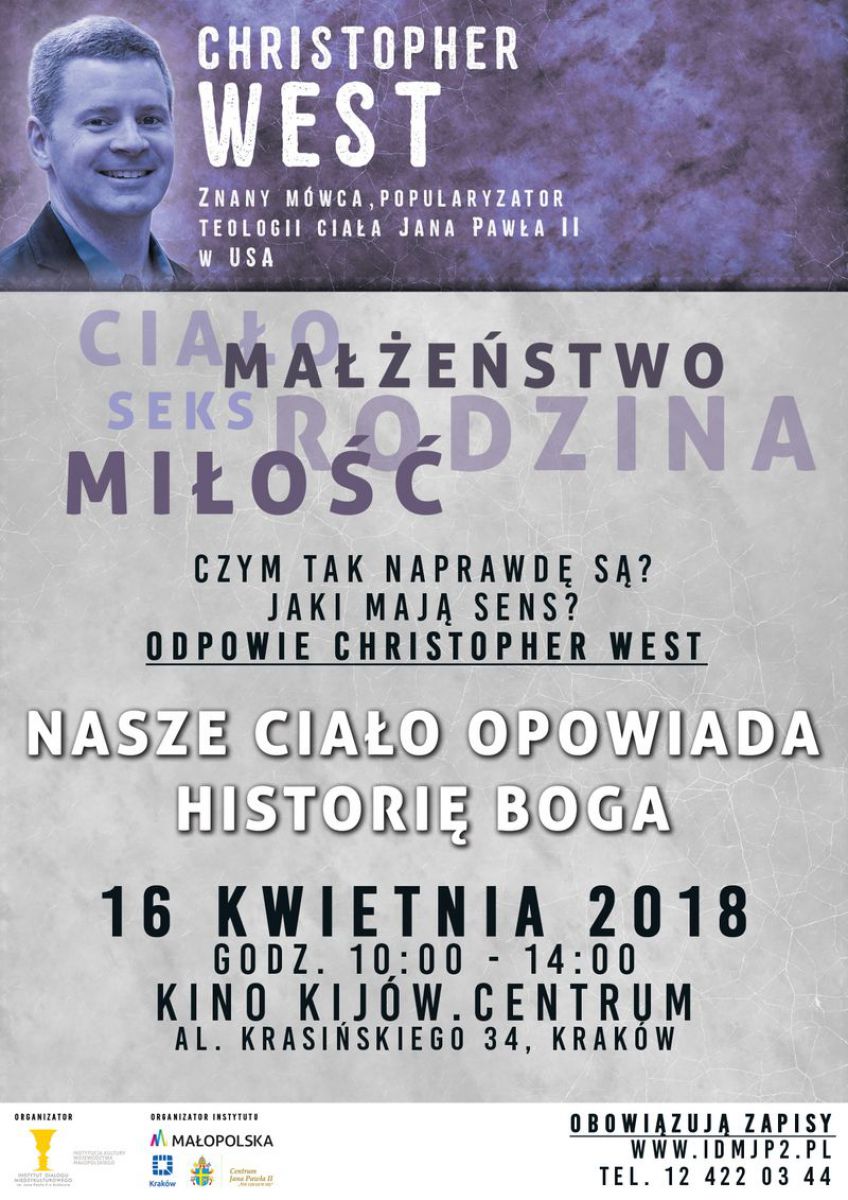 Instytut Dialogu Międzykulturowego im. Jana Pawła II w Krakowie serdecznie zaprasza na wyjštkowe wydarzenie, spotkanie z Christopherem Westem, mówcš i popularyzatorem teologii ciała w USA. Wystšpienie Chrisa pt.: "NASZE CIAŁO OPOWIADA HISTORIĘ BOGA" odbędzie się 16.04.2018 r. o godz. 10.00 w kinie Kijów.Centrum w Krakowie.
