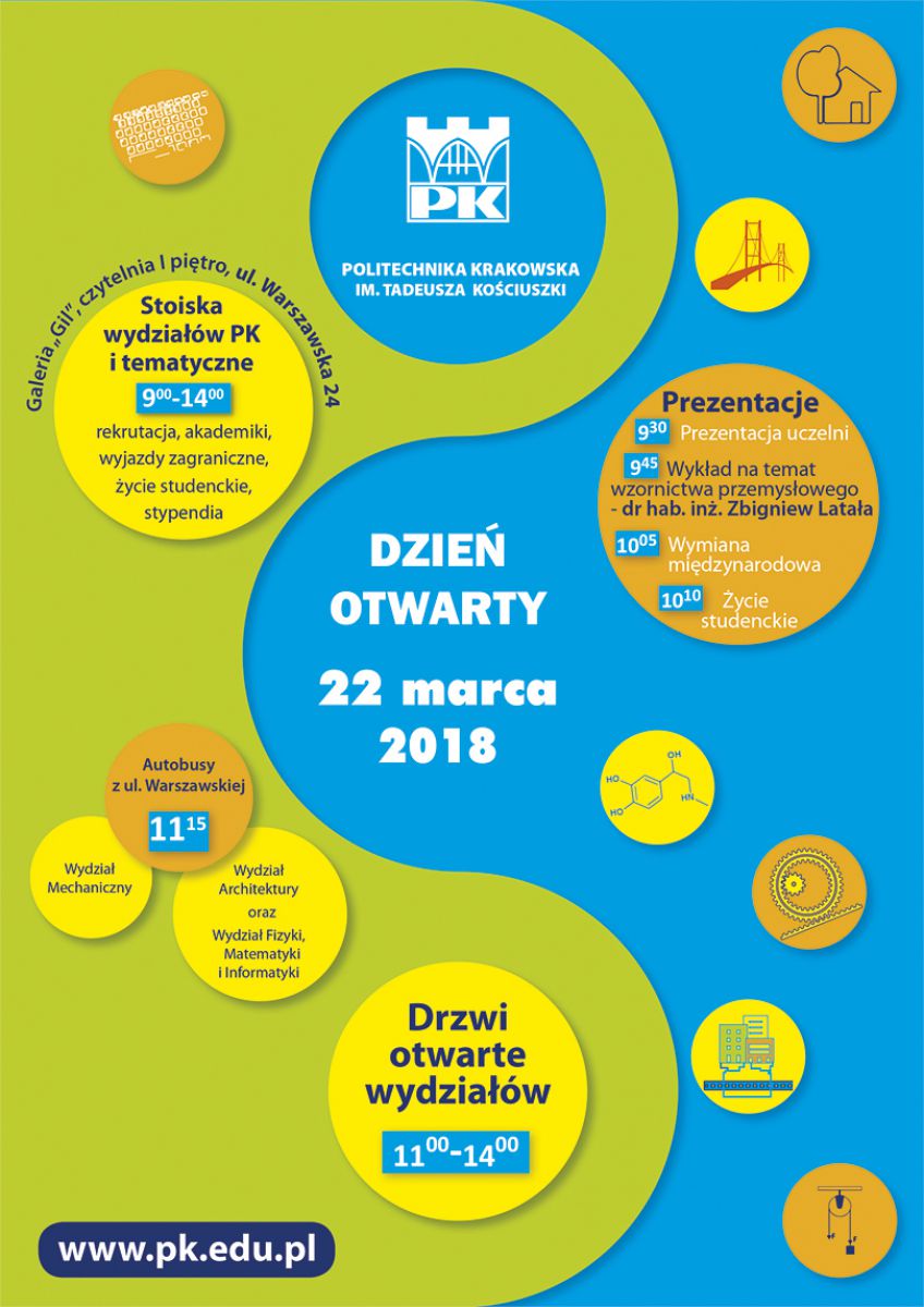 Serdecznie zapraszamy na Dzie Otwarty na Politechnice Krakowskiej! Jeste zainteresowana/zainteresowany studiami na PK? Przyjd do nas w czwartek 22 marca i zobacz, jak studiuje si na jednej z najlepszych uczelni technicznych w Polsce! Co dla Was przygotowalimy w tym dniu? Same interesujce rzeczy, m.in.: zwiedzanie wydziaw i laboratoriw, stoiska tematyczne oraz prezentacje.