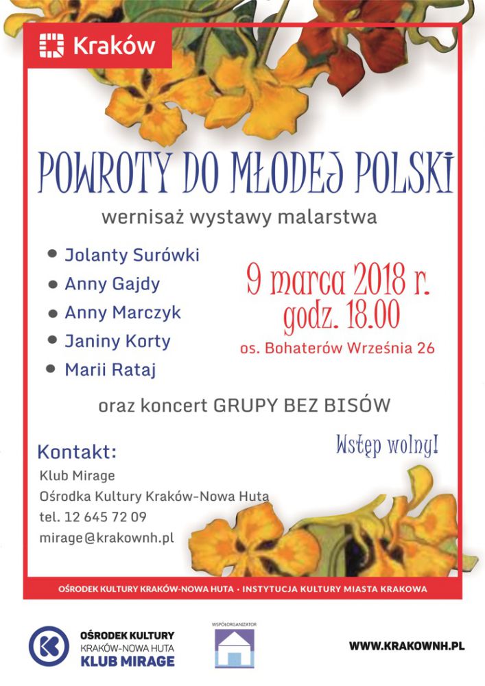 Klub Mirage Orodka Kultury Kraków-Nowa Huta (os. Bohaterów Wrzenia 26) zaprasza 9 marca o godz. 18.00 na wernisaż wystawy Powroty do Młodej Polski. To kolejna w galerii M Plus Klubu Mirage prezentacja interesujšcych prac pięciu artystek Jolanty Surówki, Anny Gajdy, Anny Marczyk, Janiny Korty, Marii Rataj. Tym razem zaprezentowany zostanie zbiór obrazów, które w swej tematyce nawišzujš do dokonań polskich malarzy Młodej Polski - epoki, która miała duże znaczenie w historii sztuki polskiej. Był to zwrot ku nowym trendom symbolizmu, impresjonizmu i ekspresjonizmu. Osiš twórczoci artyci uczynili człowieka z jego pragnieniami, marzeniami, ograniczeniami, ulegajšcego pokusom wyborów między dobrem a złem.
