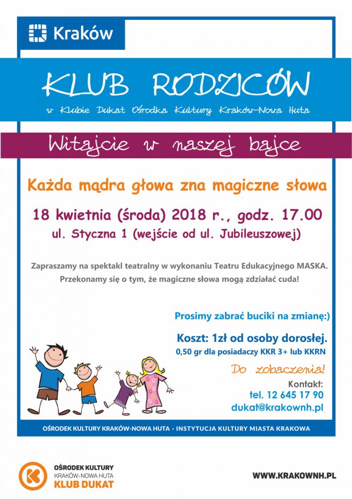 Klub Dukat Orodka Kultury Kraków-Nowa Huta (ul. Styczna 1) zaprasza 18 kwietnia o godz. 17.00 na spektakl teatralny.