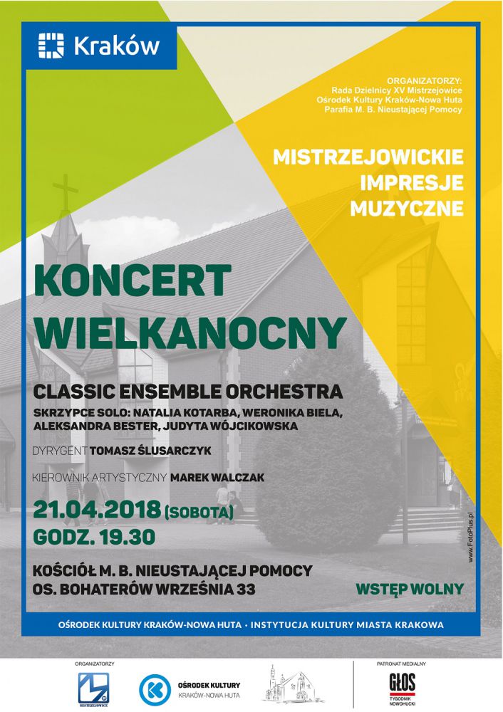W sobotę 21 kwietnia br. o godzinie 19.30 w kociele pw. Matki Bożej Nieustajšcej Pomocy na os. Bohaterów Wrzenia 33 odbędzie się Koncert Wielkanocny w ramach cyklu Mistrzejowickie Impresje Muzyczne. Podczas tego koncertu zainauguruje swojš działalnoć artystycznš Classic Ensemble Orchestra. Jest to zespół złożony z absolwentów oraz studentów krakowskiej Akademii Muzycznej.