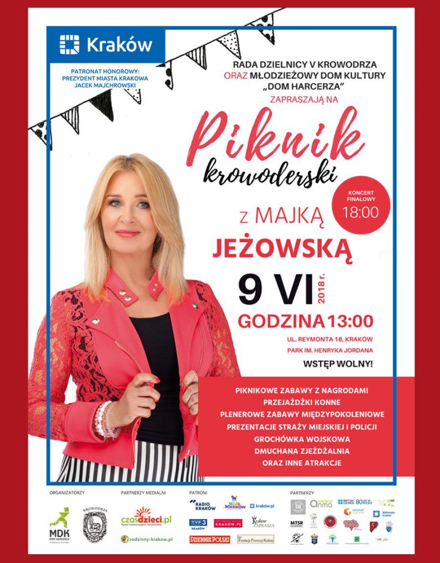 XII edycja Pikniku Krowoderskiego z Majkš Jeżowskš odbędzie się 9 czerwca 2017 roku, na terenie MDK Dom Harcerza, ul. Reymonta 18 i częci Parku Jordana w godzinach od 13.00 do 19.15.
