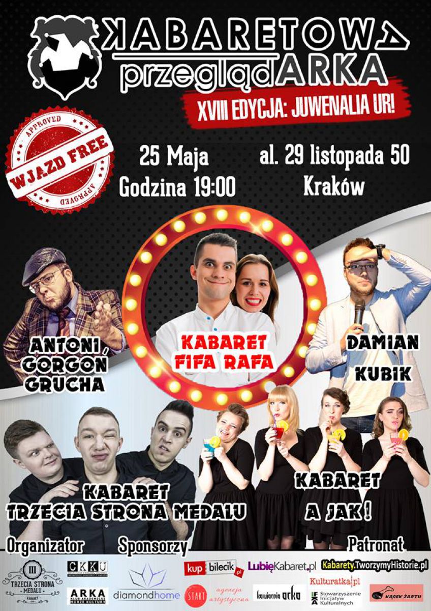 Szykujemy dla Was kolejnš, XVIII edycję Kabaretowej PrzeglšdARKI! Tym razem zapraszamy Was na ostatniš w tym sezonie edycję Juwenaliowš. Impreza zaplanowana jest w III Dzień Juwenaliów Uniwersytetu Rolniczego. Jako, że Juwenalia mamy dla Was również prezent. Dzięki owocnej współpracy z Uniwersytetem Rolniczym sezon zamykamy z przytupem i ogłaszamy wszem i wobec: DARMOWE WEJCIE!
