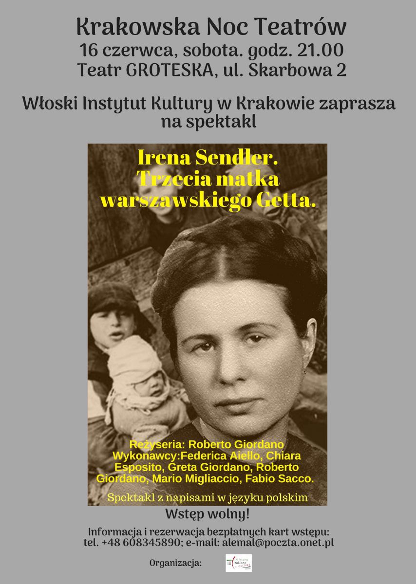 Włoski Instytut Kultury w Krakowie zaprasza na spektakl Irena Sendler. Trzecia matka warszawskiego Getta.