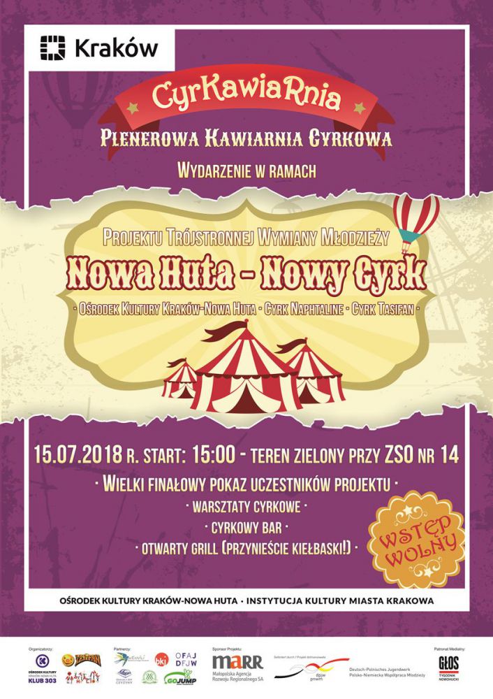 Projekt Nowa Huta-Nowy Cyrk to propozycja adresowana do młodych mieszkańców dzielnicy, majšca na celu zdobycie nowych umiejętnoci, nawišzanie przyjani, poznanie innych kultur oraz naukę i pracę w grupie z udziałem młodzieży z Polski, Niemiec i Francji. W jego ramach uczestnicy przez jedenacie dni będš uczestniczyć w warsztatach cyrkowych, zajęciach językowych oraz integrujšcych. Młodzież uczyć się będzie między innymi: żonglerki, akrobatyki partnerskiej, jazdy na monocyklu, czy clownady.