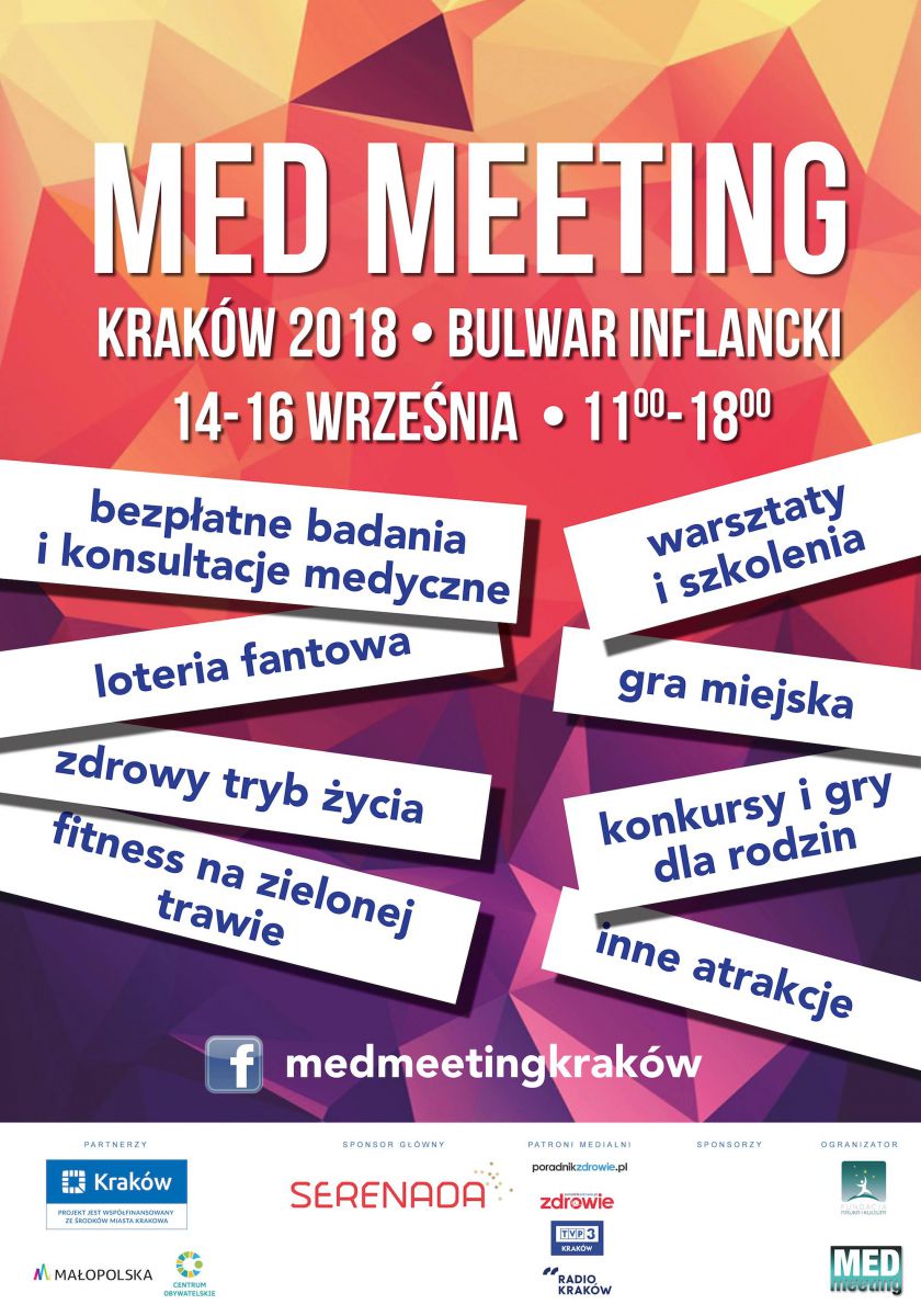 Med Meeting Kraków 2018 to trzydniowe spotkania plenerowe, które skupiajš się wokół zagadnień medycyny, profilaktyki zdrowia, edukacji prozdrowotnej i zdrowego trybu życia. Mieszkańcy Krakowa, którzy wezmš w nim udział będš mieli okazję spędzić wartociowy czas w atmosferze gier, zabaw i konkursów, a także dowiedzš się jak dbać o zdrowie swoje i najbliższych. Co jeszcze czeka uczestników wydarzenia? Bezpłatne badania i konsultacje medyczne, loteria fantowa, fitness na zielonej trawie, warsztaty i szkolenia, gra miejska, a także konkursy i gry dla rodzin oraz mnóstwo innych atrakcji.