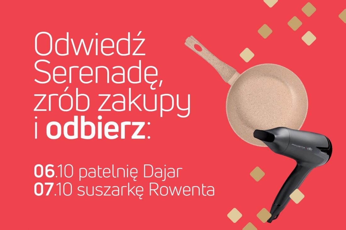Już w najbliższy weekend (6 i 7 padziernika) klienci Serenady będš mogli wzišć udział w specjalnej akcji promocyjnej. Za zakupy o równowartoci 500 zł i okazaniu paragonów, odbiorš wyjštkowe prezenty! W sobotę będš na nich czekały wytrzymałe i praktyczne patelnie Dajar, a w niedzielę będzie można odebrać suszarkę firmy Rowenta.