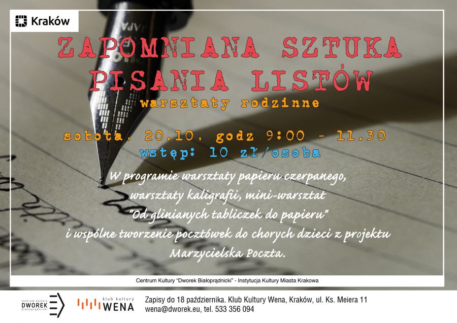 Spotkanie "Zapomniana sztuka pisania listów" odbędzie się w sobotę, 20 paŸdziernika, godz 9:00 - 11:30. Koszt: 10 zł/osoba. Zapisy do 18 paŸdziernika: 533 356 094, wena.dworek.eu