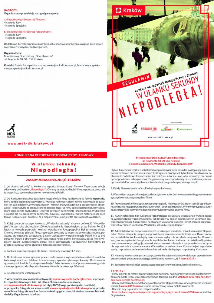 Wzięcie udziału w Konkursie odbywa się ę poprzez wysłanie Karty zgłoszenia i w przypadku reportaży filmowych linku lub pliku z filmem na adres-mailowy: sszczepanska@mdk-dh.krakow.pl lub płyty DVD oraz przesłanie odbitek fotograficznych w formacie A4 drogš pocztowš lub dostarczenie osobicie do siedziby Organizatora na adres: Młodzieżowy Dom Kultury Dom Harcerza, ul. Reymonta 18, 30-059 Kraków z dopiskiem Konkurs W ułamku sekundy. Niepodległa!.