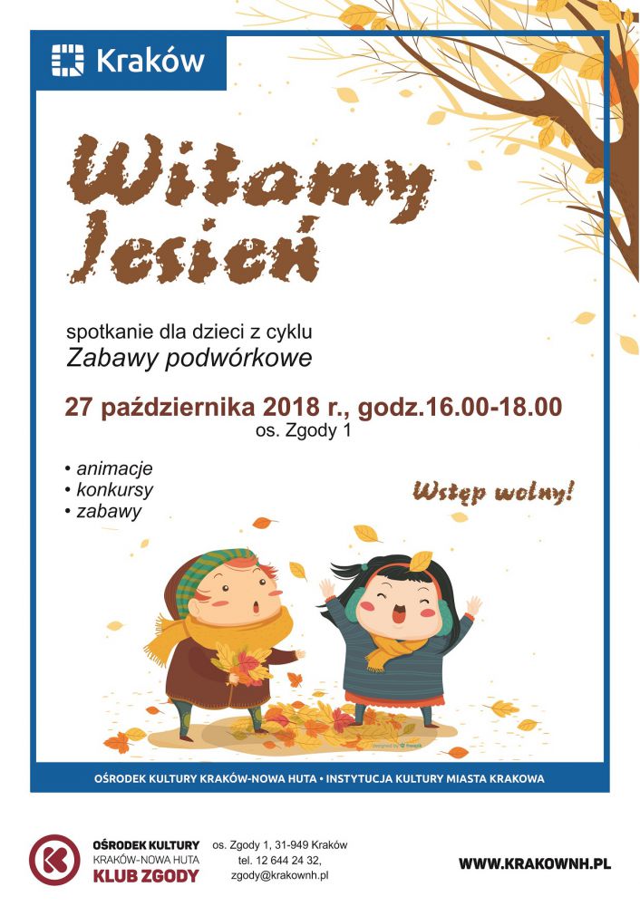 Klub Zgody Oœrodka Kultury Kraków-Nowa Huta (os. Zgody 1) zaprasza dzieci 27 paŸdziernika, w godz. 16.00-18.00 na spotkanie z podwórkowymi grami i zabawami. Celem jest wspólne miłe spędzenie wolnego czasu w sobotnie popołudnie. Impreza dla dzieci od 6 do 10 lat.